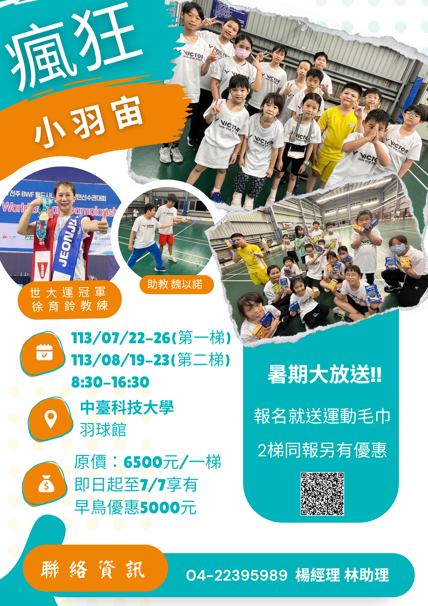 Previous Product Next Product 瘋狂小羽宙 NT$6,500 發球動作練習、挑球米字型步法講解、單打戰術講解米字型步法講解、單打戰術講解、長球、殺球動作講解練習米字型步法講解、單打戰術講解教學進度以學員學習程度彈性調整米字型步法講解、單打戰術講解 瘋狂小羽宙 數量 加入購物車 分類: 博樂學堂, 運動舞蹈 描述 描述 課程時間第一梯: 113/07/22-26第二梯: 113/08/19-23時間: 08:30-16:30 授課講師徐育鈴‧1994年第三屆世界大學運動會羽球錦標賽─女子單打冠軍、女子雙打季軍‧1994年奧地利羽球公開賽─女子雙打冠軍‧1995年奧地利羽球公開賽─女子單打冠軍、女子雙打季軍‧後繹社區大學體適能瑜珈教師‧樂齡大學體適能瑜珈教師 學費早鳥優惠價 NT$ 5000 基本資訊 備註(一)臨櫃繳費:於班次結束報名或額滿前完成繳費報名手續請至保健大樓一樓 推廣教育處 (9101辦公室)。現場接受現金、刷卡繳費(限VISA、Master卡)。(二)ATM轉帳繳費:網路線上報名者可依專屬繳費帳號以提款機或網路ATM繳交學費。郵局代號:700,轉入帳號:7000010-22181216郵政劃撥:帳號-22181216,戶名-中臺科技大學(三)傳真授權刷卡:請至本部首頁下載表格,填妥後傳真至 (04) 2239-6752。(四)本部將於開課前3-5天將開課通知置於本部首頁→開課通知,供學員下載列印,開課當日憑此通知進入上課地點,並於開課當日製發上課證供日後車輛通行使用。若您於開課前三天仍無法確認開課訊息,請務必來電洽詢,以免您的權益受損。(五)本部保留因實際需要變動上課時間、師資、教材、優待辦法之權利 退費規定1.本部因故未能開班上課,全額無息退還已繳費用。 2.學員完成報名繳費後因個人因素無法上課,依下列標準退費: (1)於實際上課日(不含當日)前提出退費申請,退還已繳納學(分)費之九成。 (2)於第二次上課日(不含當日)前提出退費申請,退還已繳納學(分)費之七成。 (3)於實際上課時數達總時數三分之一前提出退費申請,退還已繳納學(分)費之半數。 (4)已逾上課總時數三分之一者,不得以任何理由請求退費或延期。 洽詢聯絡資訊中臺科技大學(臺中市北屯區廍子路666號)保健大樓一樓 推廣教育處 (9101辦公室) 連絡電話 :(04) 2239-5989 鄭經理 傳真電話 :(04) 2239-6752 E-MAIL :500338@ctust.edu.tw 相關商品 Quick View Quick View 博樂學堂, 運動舞蹈健康自信肚皮舞(進階) NT$1,900 加入購物車 Quick View Quick View 博樂學堂, 語言學習自然發音英文歌唱班 查看內容 Quick View Quick View 博樂學堂, 運動舞蹈網球初級 NT$2,000 加入購物車