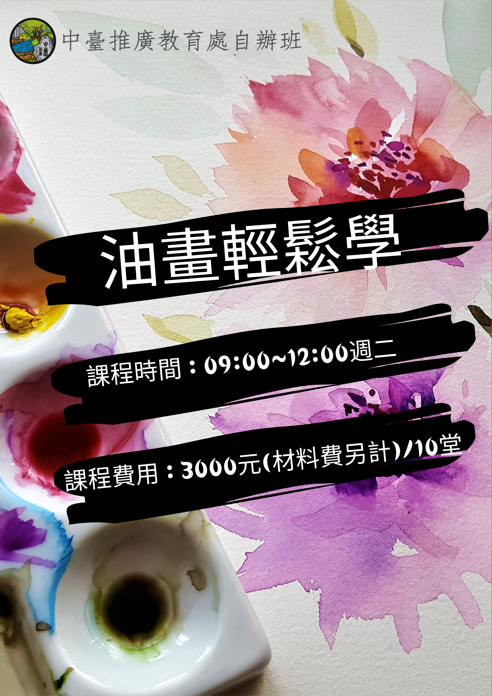 Previous Product Next Product 油畫輕鬆學 NT$3,000 建立繪畫觀念,輕鬆快樂學習油畫媒材。油畫特性介紹、名家作品欣賞、觀察風景構圖、色調、用筆練習 油畫輕鬆學 數量 加入購物車 分類: 人文藝術, 博樂學堂 描述 描述 課程時間開課中,歡迎隨時加入課程,週二 09:00~12:00 授課講師張毓國專業畫家、美術講師、大學教師、社大講師 學費NT$ 3,000/10堂插班生依堂數計 基本資訊 備註(一)臨櫃繳費:於班次結束報名或額滿前完成繳費報名手續請至保健大樓一樓 推廣教育處 (9101辦公室)。現場接受現金、刷卡繳費(限VISA、Master卡)。(二)ATM轉帳繳費:網路線上報名者可依專屬繳費帳號以提款機或網路ATM繳交學費。郵局代號:700,轉入帳號:7000010-22181216郵政劃撥:帳號-22181216,戶名-中臺科技大學(三)傳真授權刷卡:請至本部首頁下載表格,填妥後傳真至 (04) 2239-6752。(四)本部將於開課前3-5天將開課通知置於本部首頁→開課通知,供學員下載列印,開課當日憑此通知進入上課地點,並於開課當日製發上課證供日後車輛通行使用。若您於開課前三天仍無法確認開課訊息,請務必來電洽詢,以免您的權益受損。(五)本部保留因實際需要變動上課時間、師資、教材、優待辦法之權利 退費規定1.本部因故未能開班上課,全額無息退還已繳費用。 2.學員完成報名繳費後因個人因素無法上課,依下列標準退費: (1)於實際上課日(不含當日)前提出退費申請,退還已繳納學(分)費之九成。 (2)於第二次上課日(不含當日)前提出退費申請,退還已繳納學(分)費之七成。 (3)於實際上課時數達總時數三分之一前提出退費申請,退還已繳納學(分)費之半數。 (4)已逾上課總時數三分之一者,不得以任何理由請求退費或延期。 洽詢聯絡資訊中臺科技大學(臺中市北屯區廍子路666號)保健大樓一樓 推廣教育處 (9101辦公室) 連絡電話 :(04) 2239-5989 鄭經理 傳真電話 :(04) 2239-6752 E-MAIL :500338@ctust.edu.tw 相關商品 Quick View Quick View 人文藝術, 博樂學堂精湛長笛班 NT$4,000 加入購物車 Quick View Quick View 博樂學堂, 運動舞蹈羽球世界 NT$3,000 加入購物車 Quick View Quick View 博樂學堂, 運動舞蹈養生太極基本功 NT$2,000 加入購物車