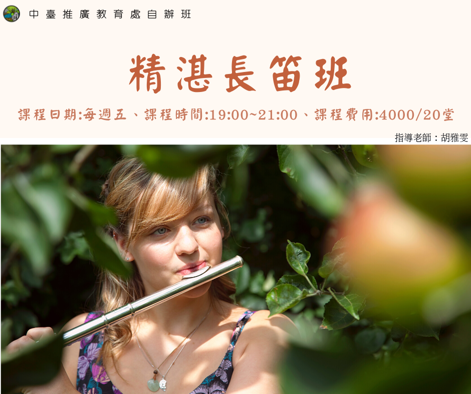 Previous Product Next Product 精湛長笛班 NT$4,000 長笛屬於輕便易於攜帶的特性,因具備三個八度的音域,使其不受限於任何音樂形式,讓我們重新建立城市的聲音與記憶。教學重點:長音練習、吹奏技巧、樂曲導讀與賞析、樂曲吹奏分組練習 精湛長笛班 數量 加入購物車 分類: 人文藝術, 博樂學堂 描述 描述 課程時間開課中,歡迎隨時加入課程週五 19:00~21:00 授課講師胡雅雯暨大成教所碩士國小社團長笛老師 學費NT$ 4,000/20堂插班生依堂數計 基本資訊 備註(一)臨櫃繳費:於班次結束報名或額滿前完成繳費報名手續請至保健大樓一樓 推廣教育處 (9101辦公室)。現場接受現金、刷卡繳費(限VISA、Master卡)。(二)ATM轉帳繳費:網路線上報名者可依專屬繳費帳號以提款機或網路ATM繳交學費。郵局代號:700,轉入帳號:7000010-22181216郵政劃撥:帳號-22181216,戶名-中臺科技大學(三)傳真授權刷卡:請至本部首頁下載表格,填妥後傳真至 (04) 2239-6752。(四)本部將於開課前3-5天將開課通知置於本部首頁→開課通知,供學員下載列印,開課當日憑此通知進入上課地點,並於開課當日製發上課證供日後車輛通行使用。若您於開課前三天仍無法確認開課訊息,請務必來電洽詢,以免您的權益受損。(五)本部保留因實際需要變動上課時間、師資、教材、優待辦法之權利 退費規定1.本部因故未能開班上課,全額無息退還已繳費用。 2.學員完成報名繳費後因個人因素無法上課,依下列標準退費: (1)於實際上課日(不含當日)前提出退費申請,退還已繳納學(分)費之九成。 (2)於第二次上課日(不含當日)前提出退費申請,退還已繳納學(分)費之七成。 (3)於實際上課時數達總時數三分之一前提出退費申請,退還已繳納學(分)費之半數。 (4)已逾上課總時數三分之一者,不得以任何理由請求退費或延期。 洽詢聯絡資訊中臺科技大學(臺中市北屯區廍子路666號)保健大樓一樓 推廣教育處 (9101辦公室) 連絡電話 :(04) 2239-5989 鄭經理 傳真電話 :(04) 2239-6752 E-MAIL :500338@ctust.edu.tw 相關商品 Quick View Quick View 人文藝術, 博樂學堂油畫輕鬆學 NT$3,000 加入購物車 Quick View Quick View 博樂學堂, 運動舞蹈網球初級 NT$2,000 加入購物車 Quick View Quick View 博樂學堂, 運動舞蹈埃及肚皮舞 NT$1,900 加入購物車