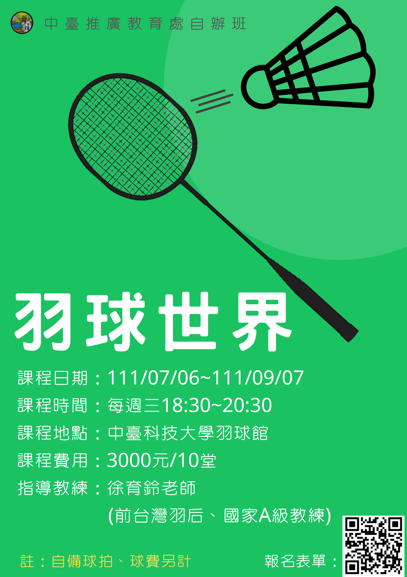 Previous Product Next Product 羽球世界 NT$3,000 發球動作練習、挑球米字型步法講解、單打戰術講解米字型步法講解、單打戰術講解、長球、殺球動作講解練習米字型步法講解、單打戰術講解教學進度以學員學習程度彈性調整米字型步法講解、單打戰術講解 羽球世界 數量 加入購物車 分類: 博樂學堂, 運動舞蹈 描述 描述 課程時間開課中,歡迎隨時加入課程 週三 18:30~20:30 授課講師徐育鈴‧1994年第三屆世界大學運動會羽球錦標賽─女子單打冠軍、女子雙打季軍‧1994年奧地利羽球公開賽─女子雙打冠軍‧1995年奧地利羽球公開賽─女子單打冠軍、女子雙打季軍‧後繹社區大學體適能瑜珈教師‧樂齡大學體適能瑜珈教師 學費NT$ 3,000/10堂插班生依堂數計 基本資訊 備註(一)臨櫃繳費:於班次結束報名或額滿前完成繳費報名手續請至保健大樓一樓 推廣教育處 (9101辦公室)。現場接受現金、刷卡繳費(限VISA、Master卡)。(二)ATM轉帳繳費:網路線上報名者可依專屬繳費帳號以提款機或網路ATM繳交學費。郵局代號:700,轉入帳號:7000010-22181216郵政劃撥:帳號-22181216,戶名-中臺科技大學(三)傳真授權刷卡:請至本部首頁下載表格,填妥後傳真至 (04) 2239-6752。(四)本部將於開課前3-5天將開課通知置於本部首頁→開課通知,供學員下載列印,開課當日憑此通知進入上課地點,並於開課當日製發上課證供日後車輛通行使用。若您於開課前三天仍無法確認開課訊息,請務必來電洽詢,以免您的權益受損。(五)本部保留因實際需要變動上課時間、師資、教材、優待辦法之權利 退費規定1.本部因故未能開班上課,全額無息退還已繳費用。 2.學員完成報名繳費後因個人因素無法上課,依下列標準退費: (1)於實際上課日(不含當日)前提出退費申請,退還已繳納學(分)費之九成。 (2)於第二次上課日(不含當日)前提出退費申請,退還已繳納學(分)費之七成。 (3)於實際上課時數達總時數三分之一前提出退費申請,退還已繳納學(分)費之半數。 (4)已逾上課總時數三分之一者,不得以任何理由請求退費或延期。 洽詢聯絡資訊中臺科技大學(臺中市北屯區廍子路666號)保健大樓一樓 推廣教育處 (9101辦公室) 連絡電話 :(04) 2239-5989 鄭經理 傳真電話 :(04) 2239-6752 E-MAIL :500338@ctust.edu.tw 相關商品 Quick View Quick View 博樂學堂, 運動舞蹈瘋狂小羽宙 NT$6,500 加入購物車 Quick View Quick View 博樂學堂, 運動舞蹈體能有氧筋膜滾筒皮拉提斯 NT$2,500 加入購物車 Quick View Quick View 博樂學堂, 運動舞蹈健康自信肚皮舞(進階) NT$1,900 加入購物車